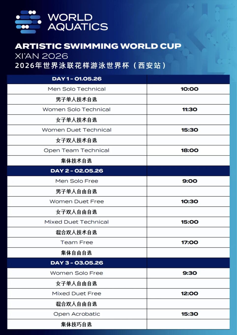 首场比赛——男子单人技术自选将于5月1日10:00开始,最后一场比赛——集体技巧自选则在5月3日15:30举行。